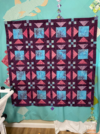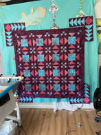 The inspiration for this quilt came from talking with a quilting friend when we could still go places and do things with people in large crowds. We were at a book reading with our kids and we were discussing needing a pattern that had a large focal square for novelty prints. We both love novelty prints and thinking of these for large scale floral fabrics or crazy cat fabric. The quilts finish at Throw 76” x 76” and Queen 88”x88”.