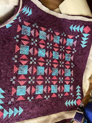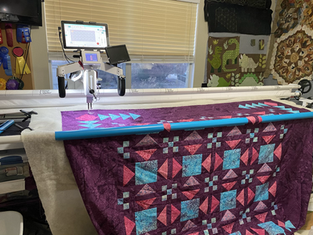 So I had big plans to quilt this quilt with fancy ruler work and repeating the flying geese motifs through the quilting. With my broken arm still in a cast and a complete inability to hold the ruler, I gave up that idea and went with an all over ribbon hearts design. The Computerized quilting only requires enough mobility in my left arm to pull up the bobbin thread. It took me a while after I broke it to be able to do even that. As long as I am doing computer aided quilting the hardest part at this point is loading the quilt. Even then I only have completed 3 customer quilts and 2 of my own, including this one, since I broke it. Some times you just have to roll with the punches.