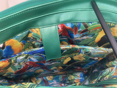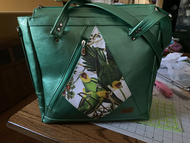 I chose for mine a Spoonflower print of Audobon's Carolina Parakeets on a linen cotton canvas. The Green is a Imperial Green Jetstream I purchased from NM Fabrics and Foam. They are walking distance from my office. The hardware I purchased from Emmaline Bags. Their strap ends are my new favorite things. The green zippers are from byAnnie. I mean if I have matching green zipper tape why not use I chose two Hoffman Call of the Wild prints for the lining. One for the external pockets and the other for the bag lining. I stabilized all of the external pieces with decovil light that I kept out of the seam allowances. All of the lining pieces pieces got stabilized with SF101. The linen cotton canvas got both. I used 3/16 automotive foam for the foam interfacing. I chose option C with the tote straps and the cross body strap, knowing the kid will have to be carrying it with her as she walks to school every day. I added an internal zip pocket as well. Over all this pattern went together quickly and fairly easily.