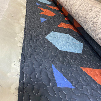 My original idea on this quilt was to straight line quilt this quilt. I normally detest the actually act of straight line quilting, it is so mind numbingly boring when you are quilting. I saw some really awesome uses of it at QuiltCon2022. It is really nice when you want to add texture but not detract from the over all quilting. My second idea was to half inch pebbles over the entire quilt top, to go back to the feel of mosaic tiles. Luckily one of my friends pointed out that wow that is just a bad idea. Do you know how long it will take you to pebble a top that big with half inch pebbles? Also the last quilt you did that with you used something like 7000m of thread. Are you really sure you want to do that again? It made me rethink the quilting and I pulled in elements of both the straight line quilting and the pebbles. I ended up breaking up the straight line quilting and turning it into a basket weave in the background. I ended up picking out motifs for each of the shapes and colors. I did keep some of the pebbling and put it in the blue diamonds. For the most part it is all straight line ruler work quilting. I chose colors of glide thread to match each of the fabrics and did tons of starts and stops. Before I went in and quilted the entire top I basted my layers together with water soluble thread. I did this because I used a layer of cotton batting and a layer of wool batting. The large stipple I did with the water soluble thread allowed me to keep everything from shifting as I did the super dense quilting. I will be totally be doing this again on any quilt with lots of custom quilting. While it took me less than two weeks to piece the top it took me almost an entire month to quilt the quilt.