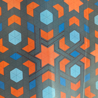 This is the newest quilt in my tile series. There is no surprise here that I turn to tile work for inspiration. Most of my previous quilts have had some sort of Roman inspiration. This quilt is inspired by Islamic Egyptian tile work. I got my fat-eight bundle last year for the Windham Challenge for Quilt Con 2023. I was originally going to do something different. I ran into challenge getting the fabric. I had per-ordered the fabric in July and then it was September and my order was cancelled. At that point I couldn't get the fabric in quantities that I was looking for. Mostly I couldn't get the cream. So I pivoted and went a different way. I went back through my notebooks of ideas. I started piecing this. I made the whole top in less than two weeks.