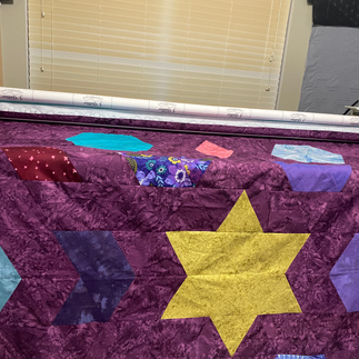 Alcyone is made from an aubergine batik fabric and scraps from my sewing room. I will admit that hexagon math is hard and I ended up with a quilt that I wasn't sure what size it was going to be until I started to piece it. Mostly cause I was having a hard time figuring out what the finished size was of my blocks due to the quarter inch seam. So what I anticipated as being a good size throw ended up being a large queen sized quilt. And then there were two of them.